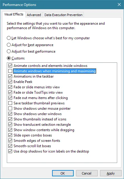 The easiest way to access this is to type ‘performance’ in the taskbar search box, and select ‘Adjust the appearance and performance of Windows’ from the results. ↩