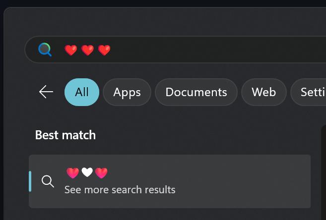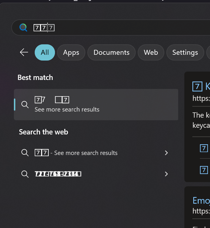 There are other weird things that happen with some emoji sequences. Take this Start Menu search for 7️⃣7️⃣, for example: