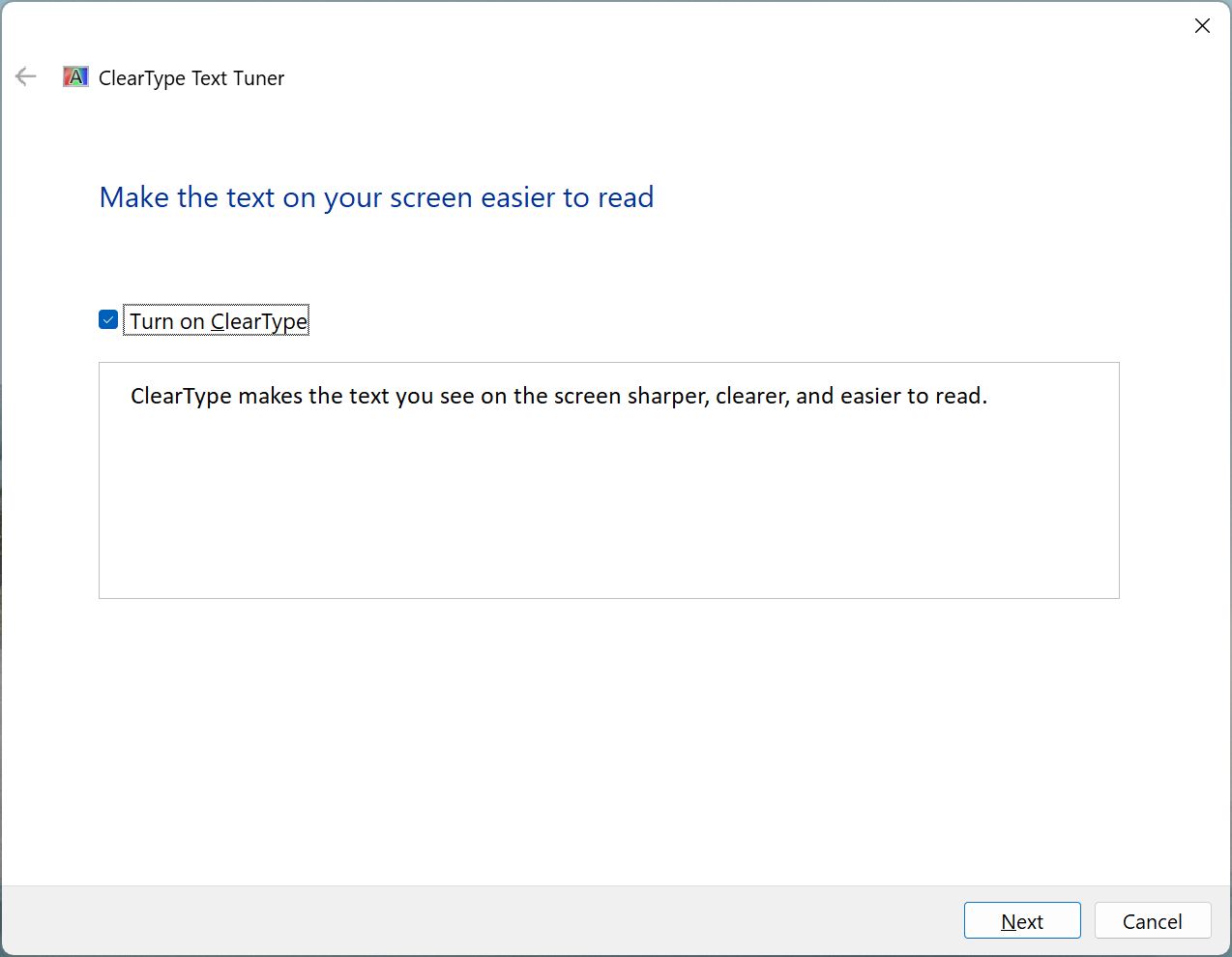 The first step contains a single option – ‘Turn on ClearType’: