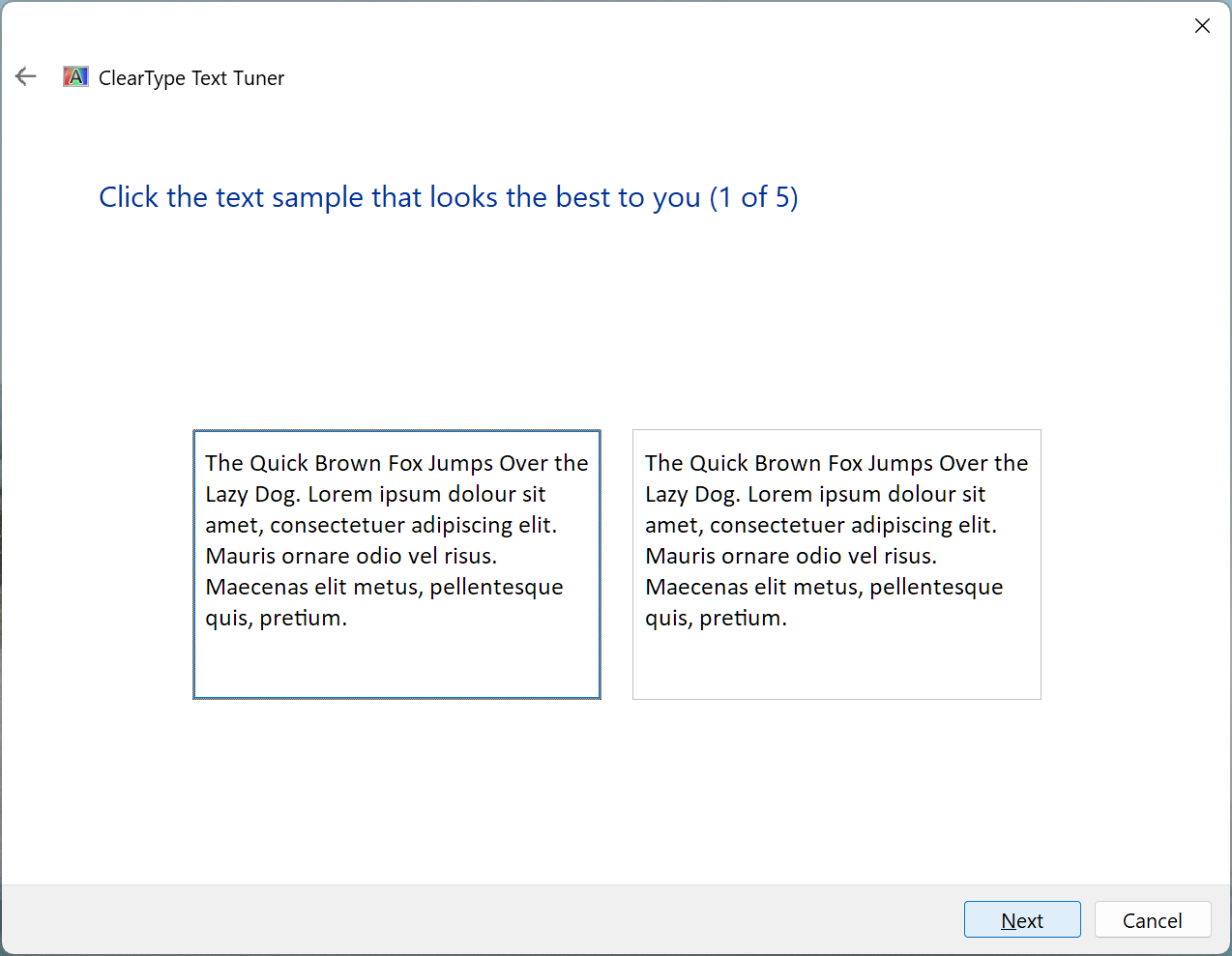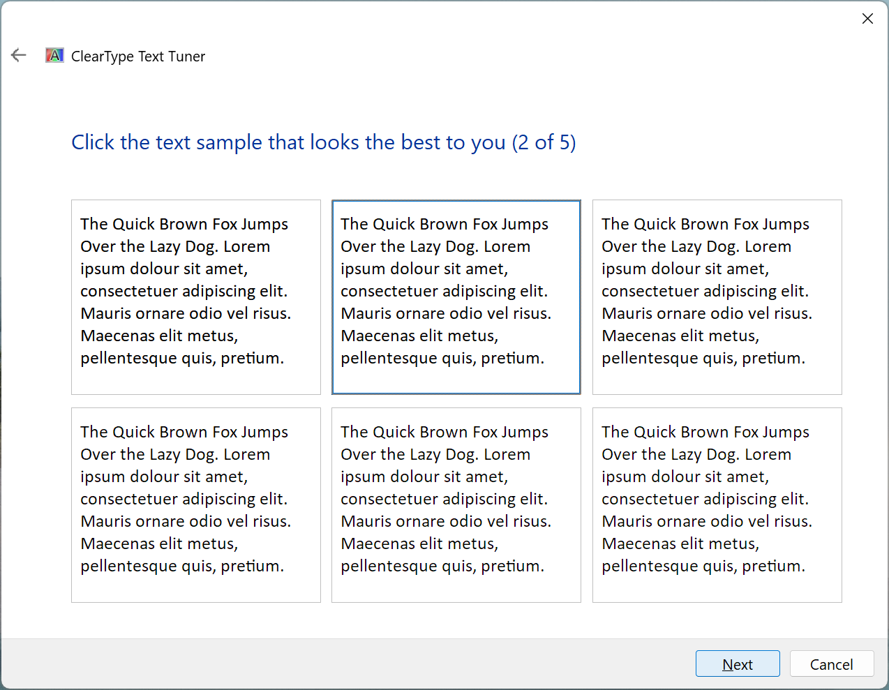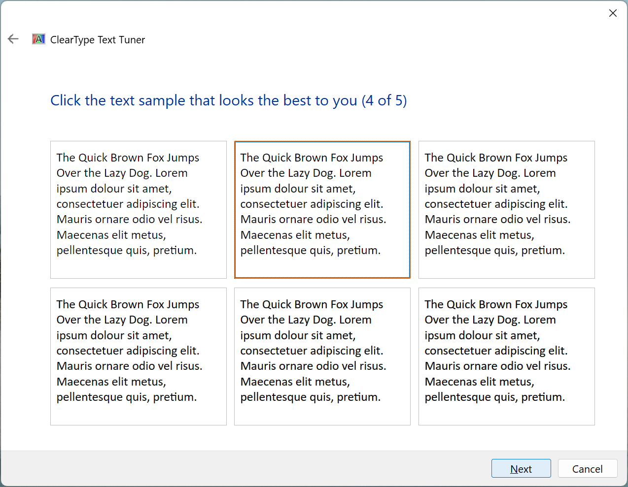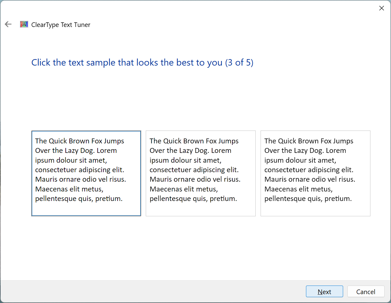 If you have multiple displays, this step only appears when tuning the primary display. (For non-primary displays, this step is skipped and all the ‘Click the text sample that looks the best to you’ steps are renumbered.)