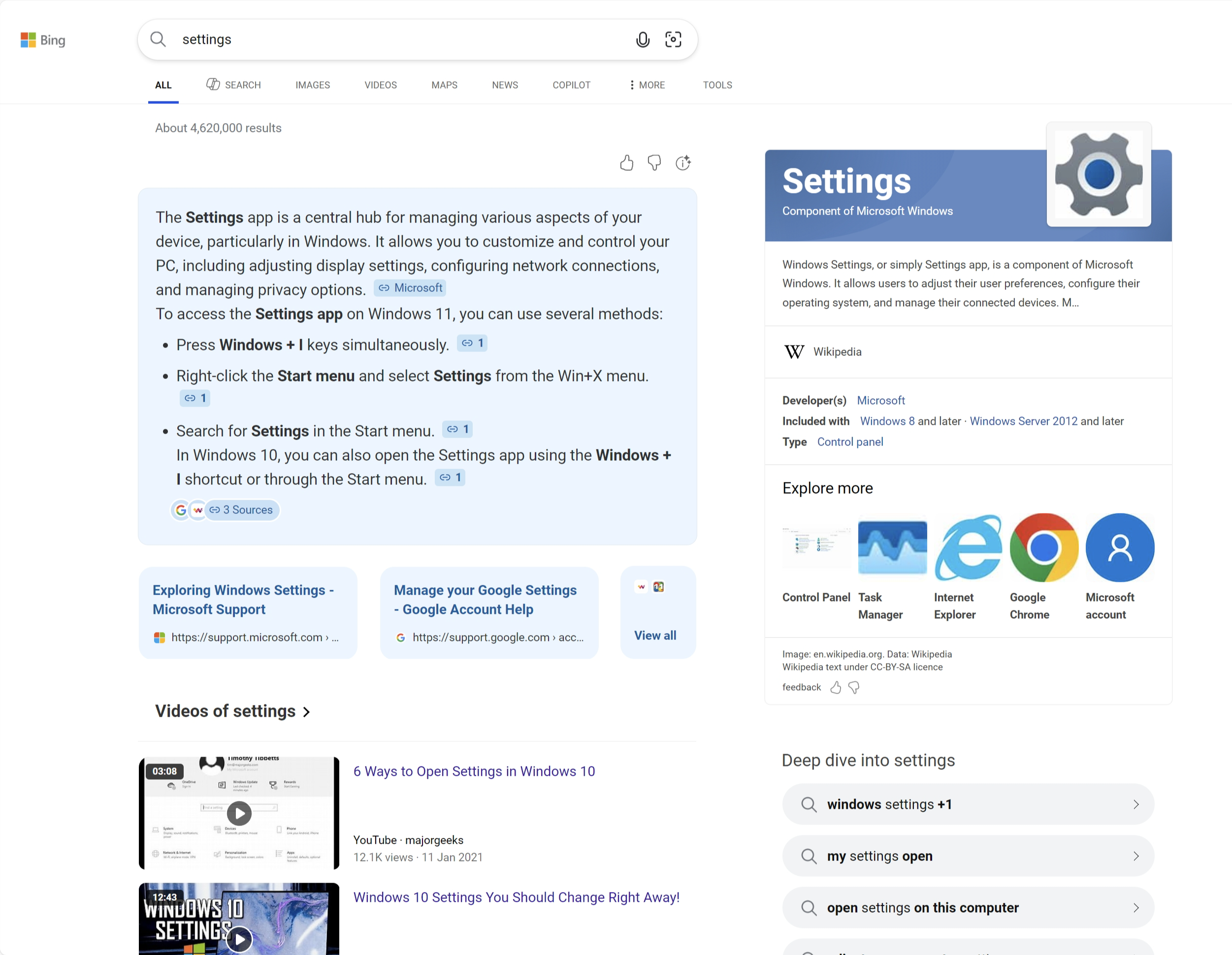 Microsoft Edge opened, with the Bing search results for ‘Settings’ open: